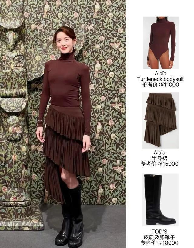 她穿着这套Alaia品牌的套装,显得胸塌肚凸,不知道是不是内衣没有选择好的原因,她的胸型显得很塌,而腹部却凸起来,有点肋骨外翻,整体形象一言难尽,幸亏脸漂亮,还拉回不少分。